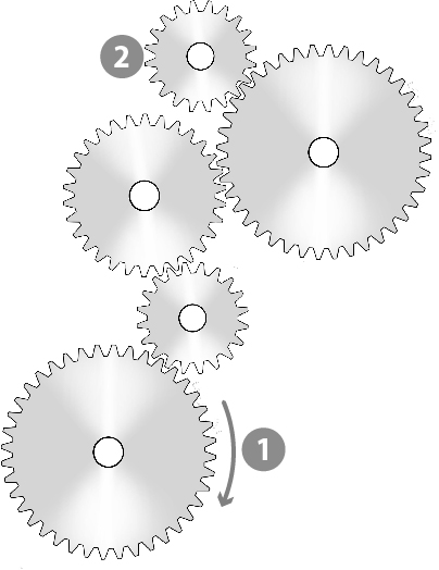 Greifen zwei Zahnräder ineinander, fasst immer ein Zahn des einen Rades in eine Vertiefung des zweiten. Es gilt also: Das zweite Rad wird um so viele Zähne weiterbewegt, wie durch die Rotation von Rad 1 vorüberlaufen. In einer Kette mehrerer ineinandergreifender Zahnräder lässt sich dies fortsetzen: Ein drittes Rad wird um so viele Zähne weiterbewegt, wie durch die Rotation von Rad 2 vorübergelaufen sind, ein viertes so viel, wie durch die Rotation von Rad 3 vorübergelaufen sind usw. Einfacher ausgedrückt: Jedes Zahnrad in dieser Kette rotiert um gleich viele Zähne weiter.