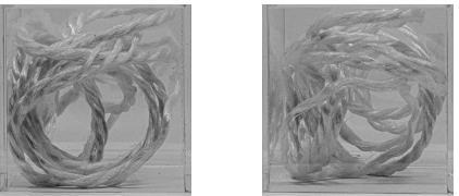 Du erhälst zwei Abbildungen eines durchsichtigen Würfels, der kleine Schläuche, Kabel, Wollfäden oder Ähnliches beinhaltet. Die jeweils linke Abbildung zeigt immer die Vorderansicht (Frontansicht) des Würfels. Finde heraus, von welcher Seite der Würfel auf dem zweiten Foto abgebildet ist: Handelt es sich um die Ansicht von rechts (r), links (l), unten (u), oben (o) oder hinten (h)?